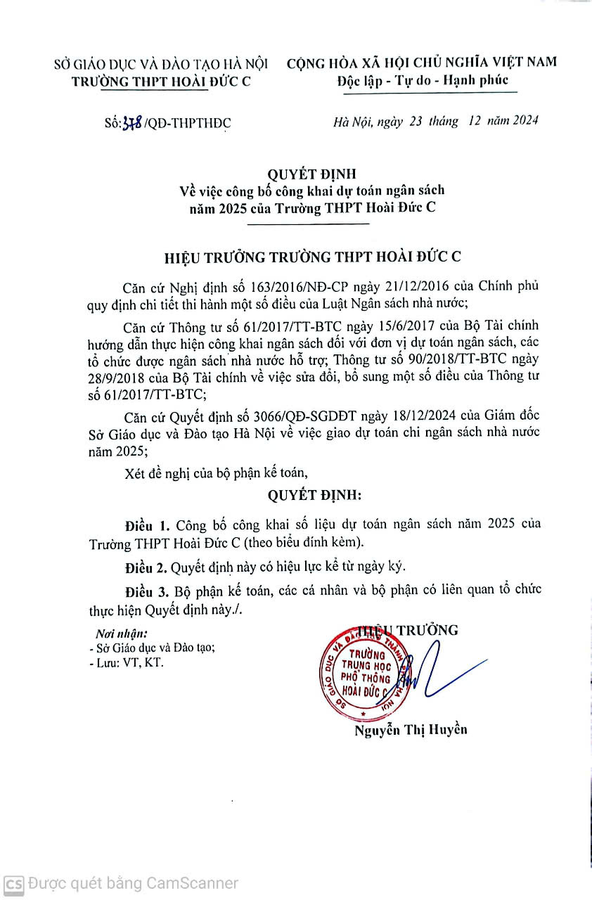 QUYẾT ĐỊNH - Về việc công bố công khai dự toán ngân sách năm 2025 của trường THTP Hoài Đức C