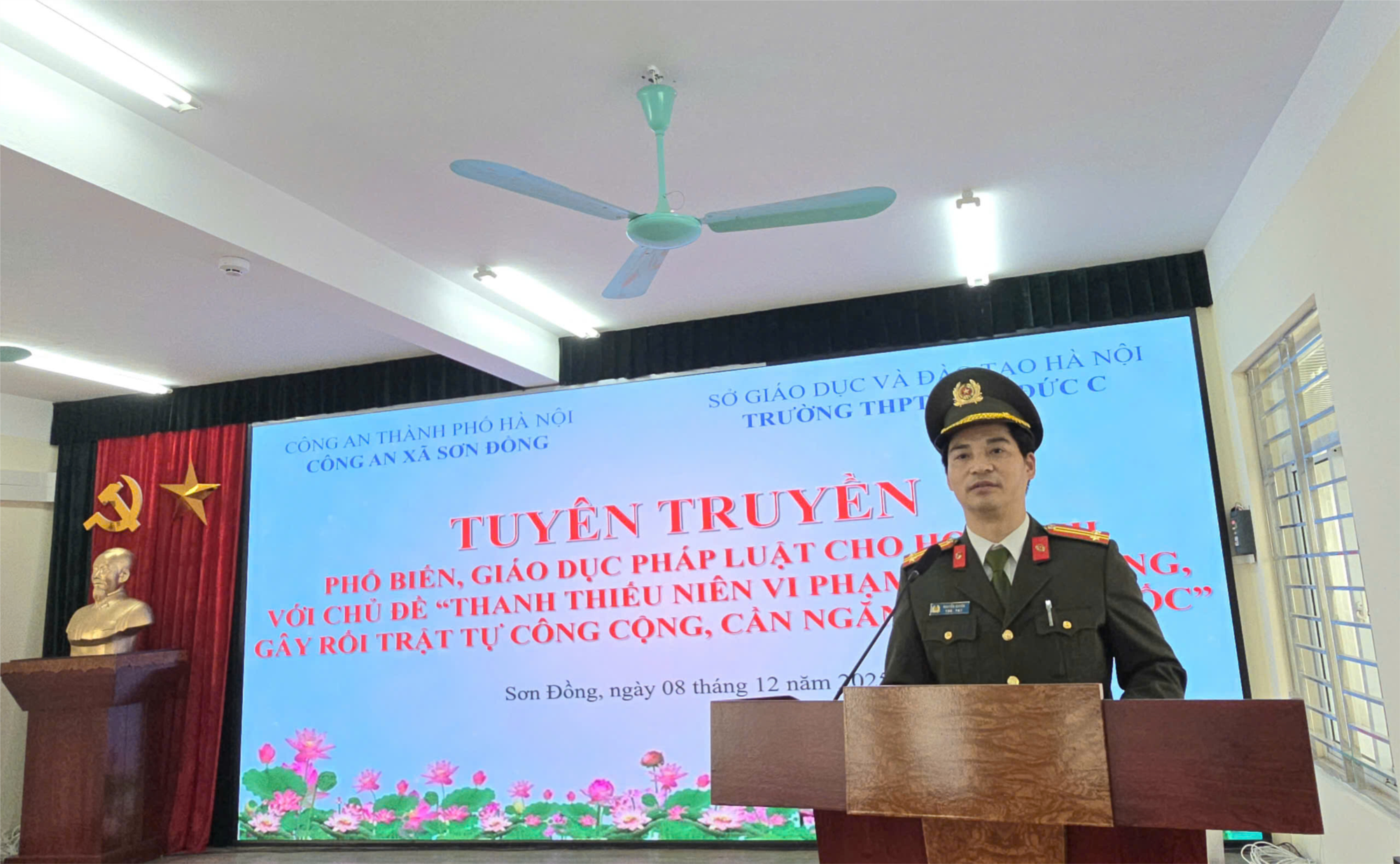 Buổi tuyên truyền có sự hiện diện của Trung tá Nguyễn Quyền – Tổ trưởng Tổ An ninh, Trung tá Khuất Tùng Anh – Tổ phòng chống tội phạm (Công an xã Sơn Đồng), cùng các thầy cô trong Ban Giám hiệu, giáo viên chủ nhiệm và đông đảo học sinh toàn trường.
